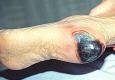 If exposed to a relatively dry atmosphere, however, as found in a hospital ward or a centrally heated room, dead tissue rapidly loses moisture and becomes dehydrated. As it does so it shrinks and progressively darkens until it eventually becomes olive green or black and hard and dry to the touch. (Image 2),